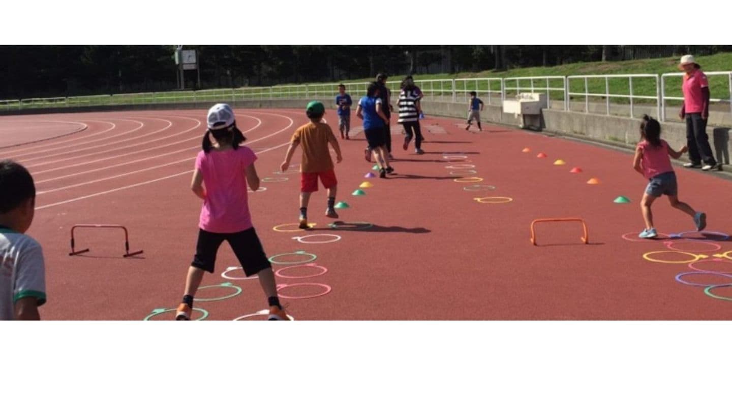 ランニング、基礎的な体操、ダッシュ練習、ハードル走、ボール投げ、リレー走など(時期をみて幅跳び、ゴムとびなどの跳躍)